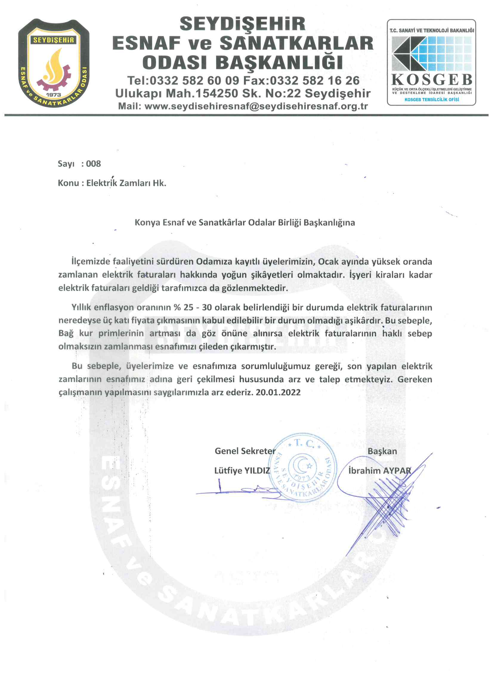 Elektriğe yapılan fahiş zamlara karşı oda tarafından resmi itiraz süreci başlatıldı. Üyelerin haklarını korumak için ilgili kurumlara başvuru yapıldı.